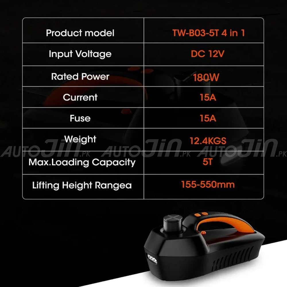Make tyre changes safer and faster with the 4 in 1 electric car jack kit. Plug it into your 12V socket, place it under the vehicle, and lift up to 5 ton with the push of a button, so you do not have to struggle with a manual jack on hot roads or in late night emergencies. The kit is designed for cars, SUVs and light commercial vehicles commonly used in Pakistan and it comes with useful add ons that help you lift, remove nuts and do a quick roadside tire change from one compact box. Keep it in the boot and you are ready for motorway trips, northern tours and daily city driving.