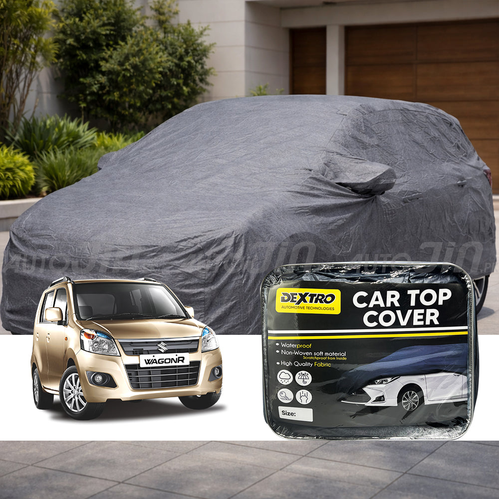 This top-of-the-line car top cover fits the Suzuki Wagon R. The top cover is composed of waterproof fabric from the outside and non-woven cotton cloth from the inside. The top cover protects the vehicle's surface from being scratched, UV heat, water, and more. It also has elastics in the front and back of the top cover for grip and comes with door zipping.