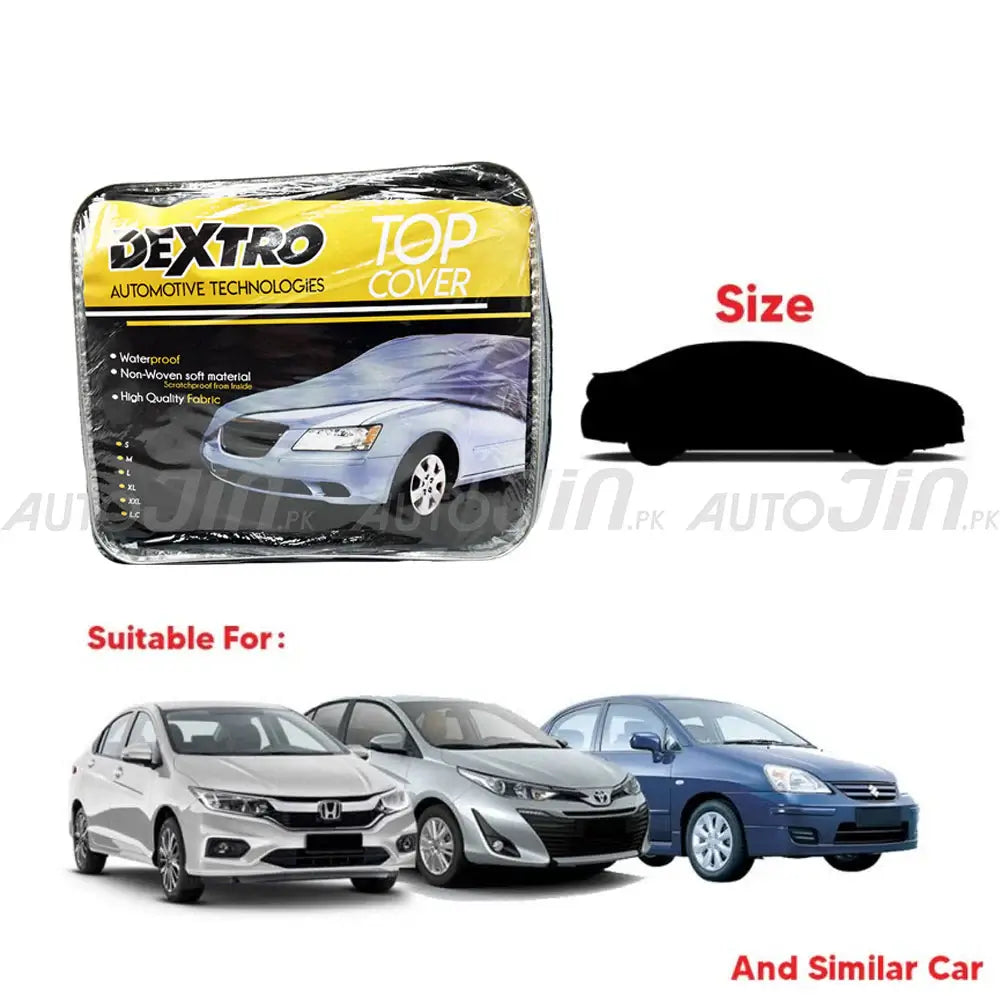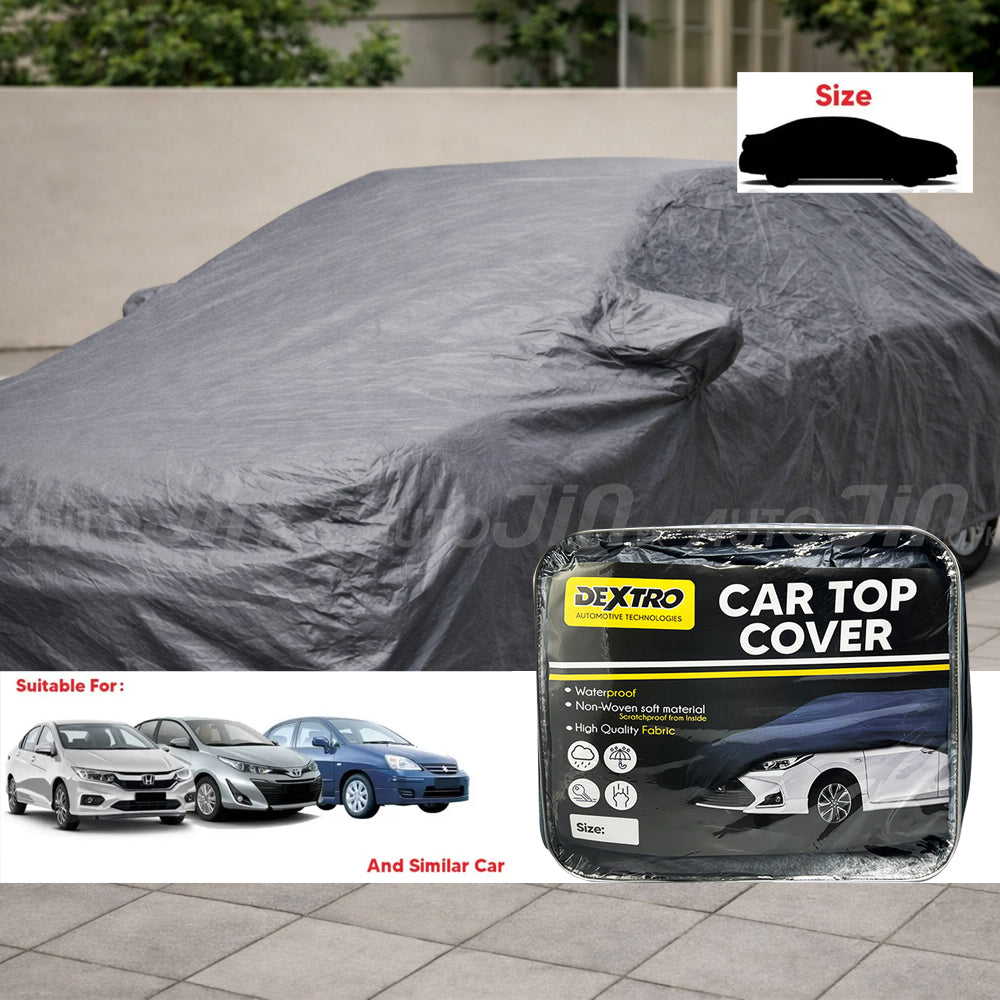 This top-of-the-line car top cover fits the sedan. The top cover is composed of waterproof fabric from the outside and non-woven cotton cloth from the inside. The top cover protects the vehicle's surface from being scratched, UV heat, water, and more. It also has elastics in the front and back of the top cover for grip and comes with door zipping.