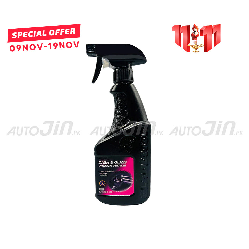 The Gladiator Dash & Glass Interior Detailer is a concentrated liquid made with a professional formula. It works quickly to remove dust and stains from your car's windscreen, dashboard, and interior surfaces, helping to keep them shiny and prevent scratches on the surface. This versatile cleaner can also be used for household cleaning.